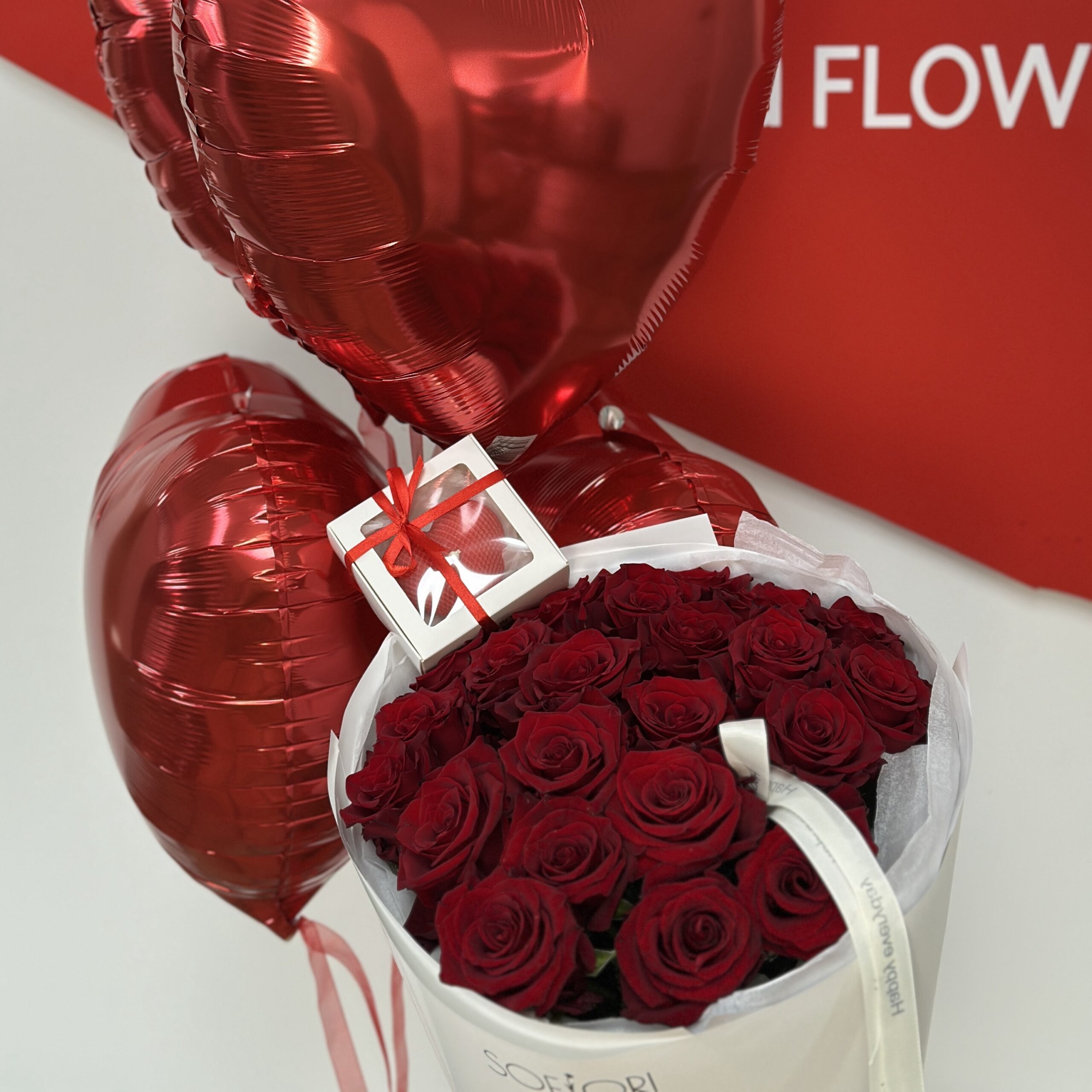 Red roses are the language of passion. Twenty-four roses say "I am yours" in the loudest way. Soy wax represents a pure, clean fire. The heart balloons symbolize a floating joy. Together, they mean a complete, deep devotion. This gift says your love is limitless.