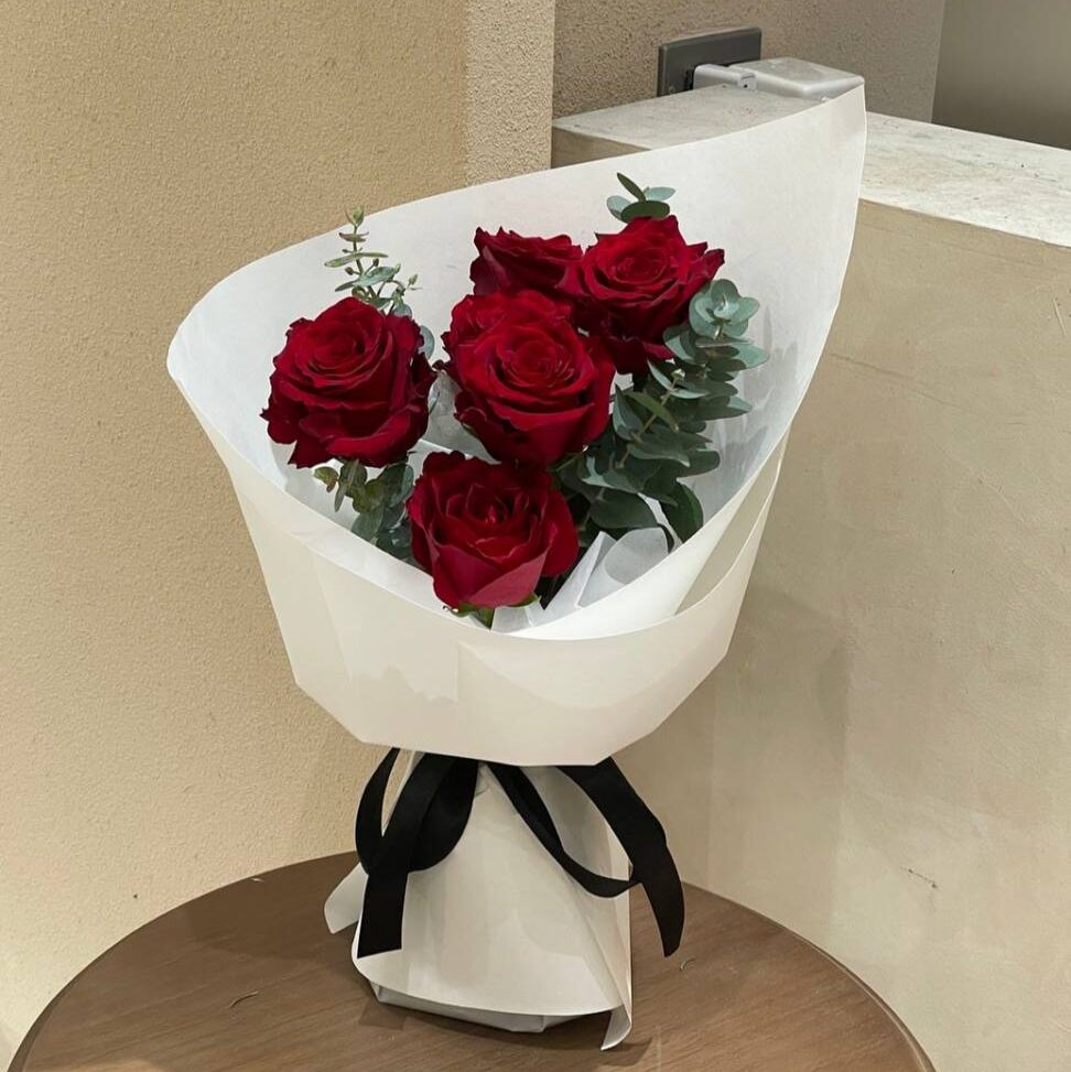 The Blooms: 5 premium, long-stemmed Explorer Red Roses paired with fresh Eucalyptus greenery.