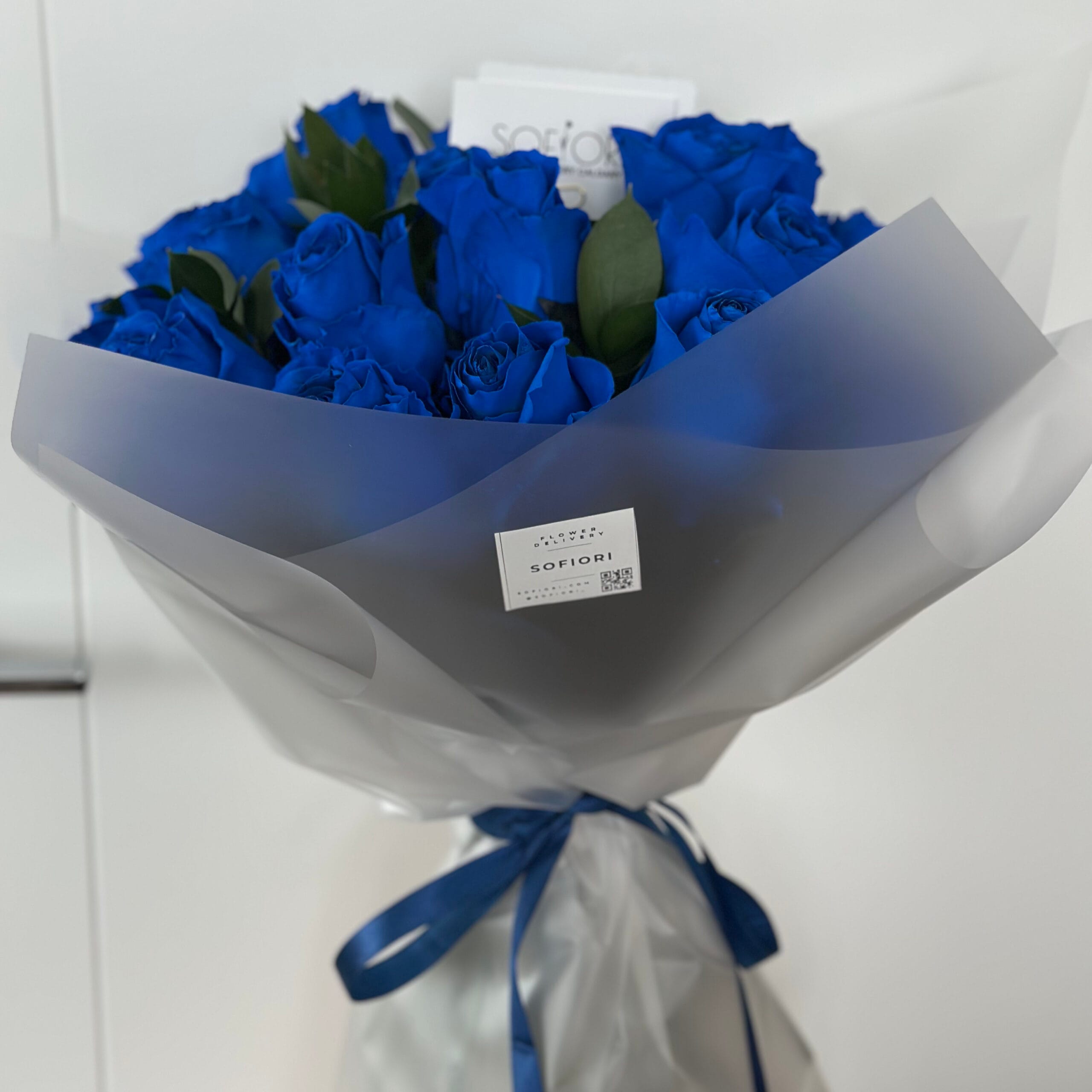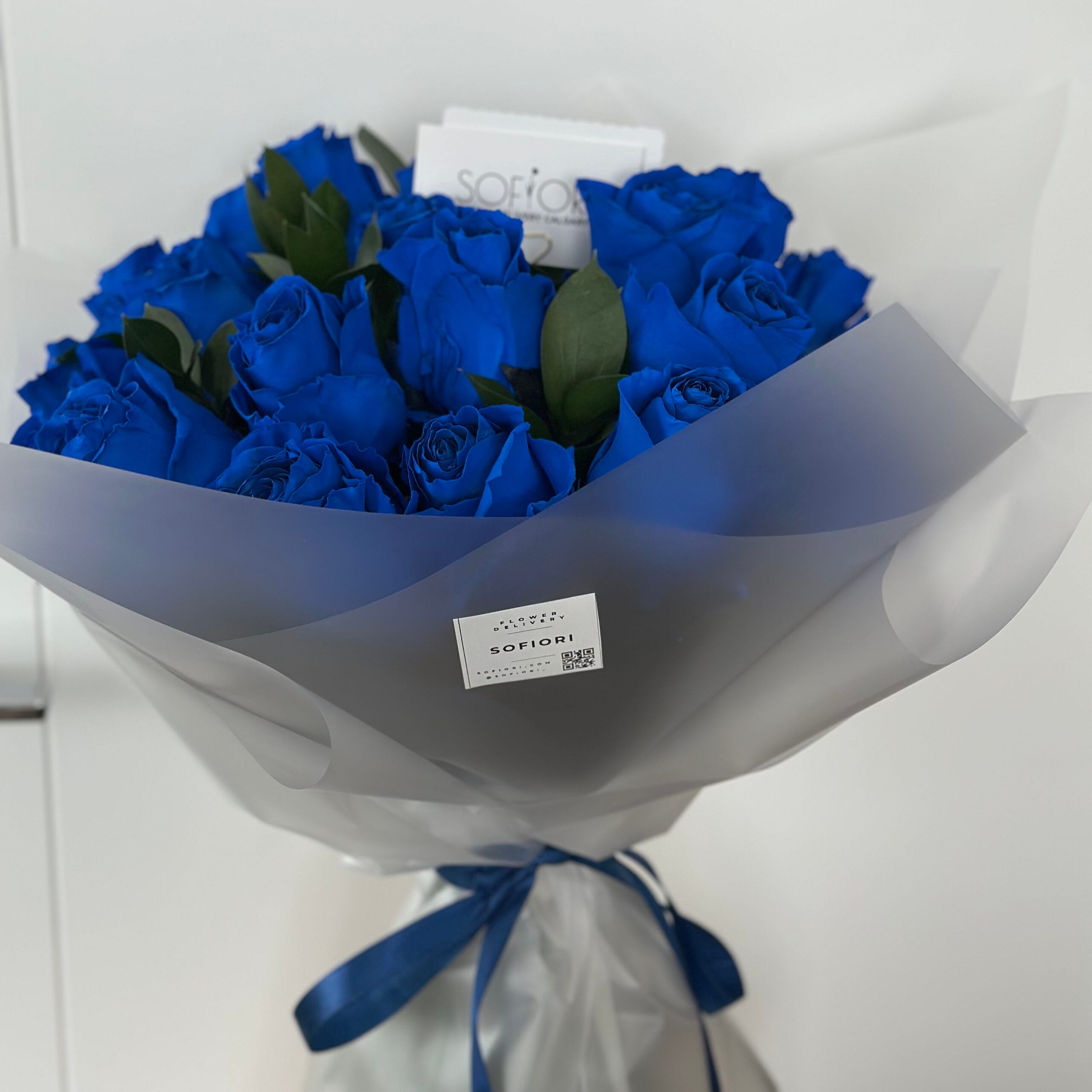Luxurious 25-Stem Blue Rose Bouquet Indulge someone special with our magnificent 25-stem bouquet of vibrant blue roses, expertly crafted by the florists at SOFIORI. Wrapped in a soft gray paper and tied with a blue ribbon, this exquisite arrangement is available for same-day flower delivery in Calgary.