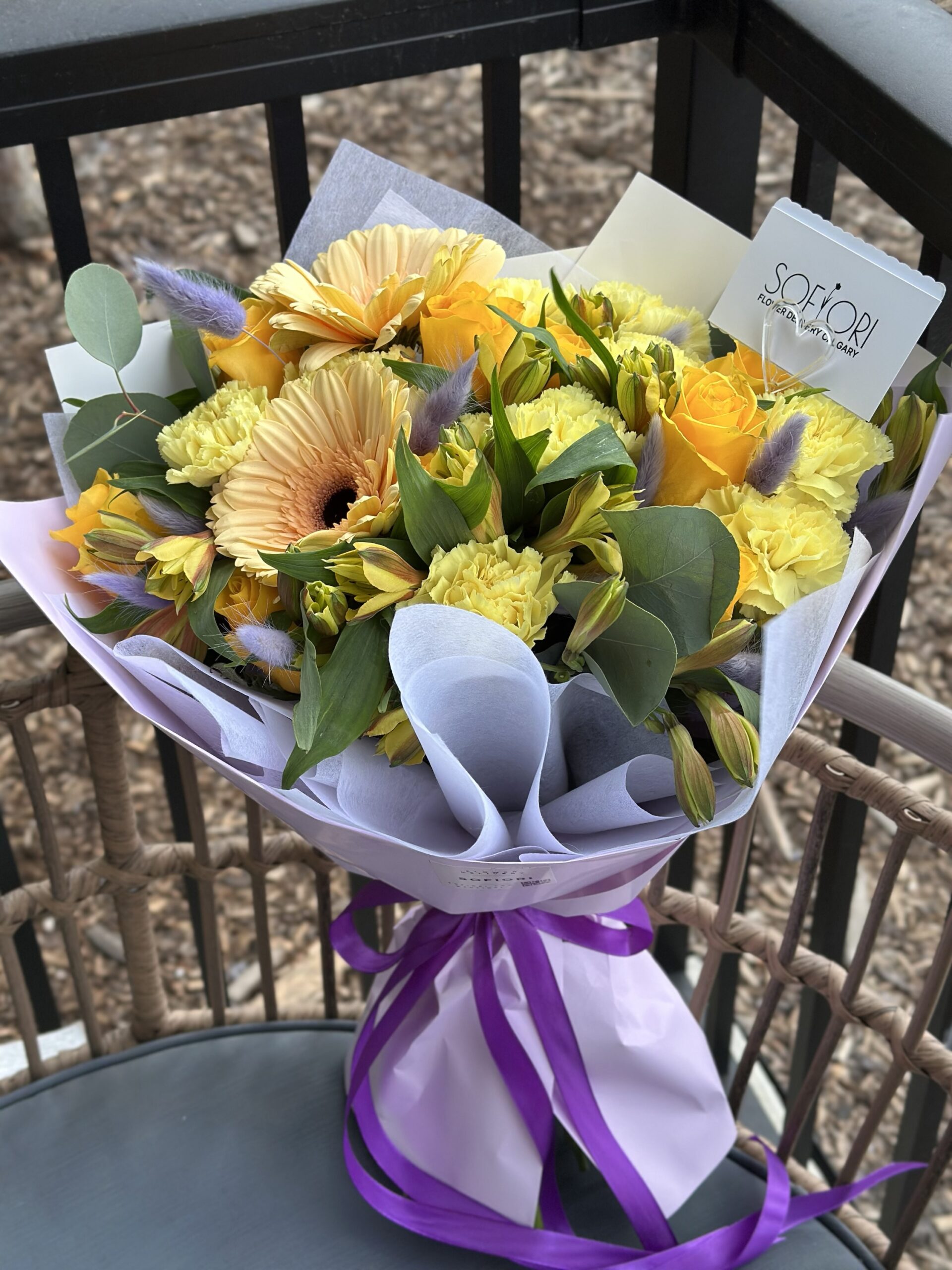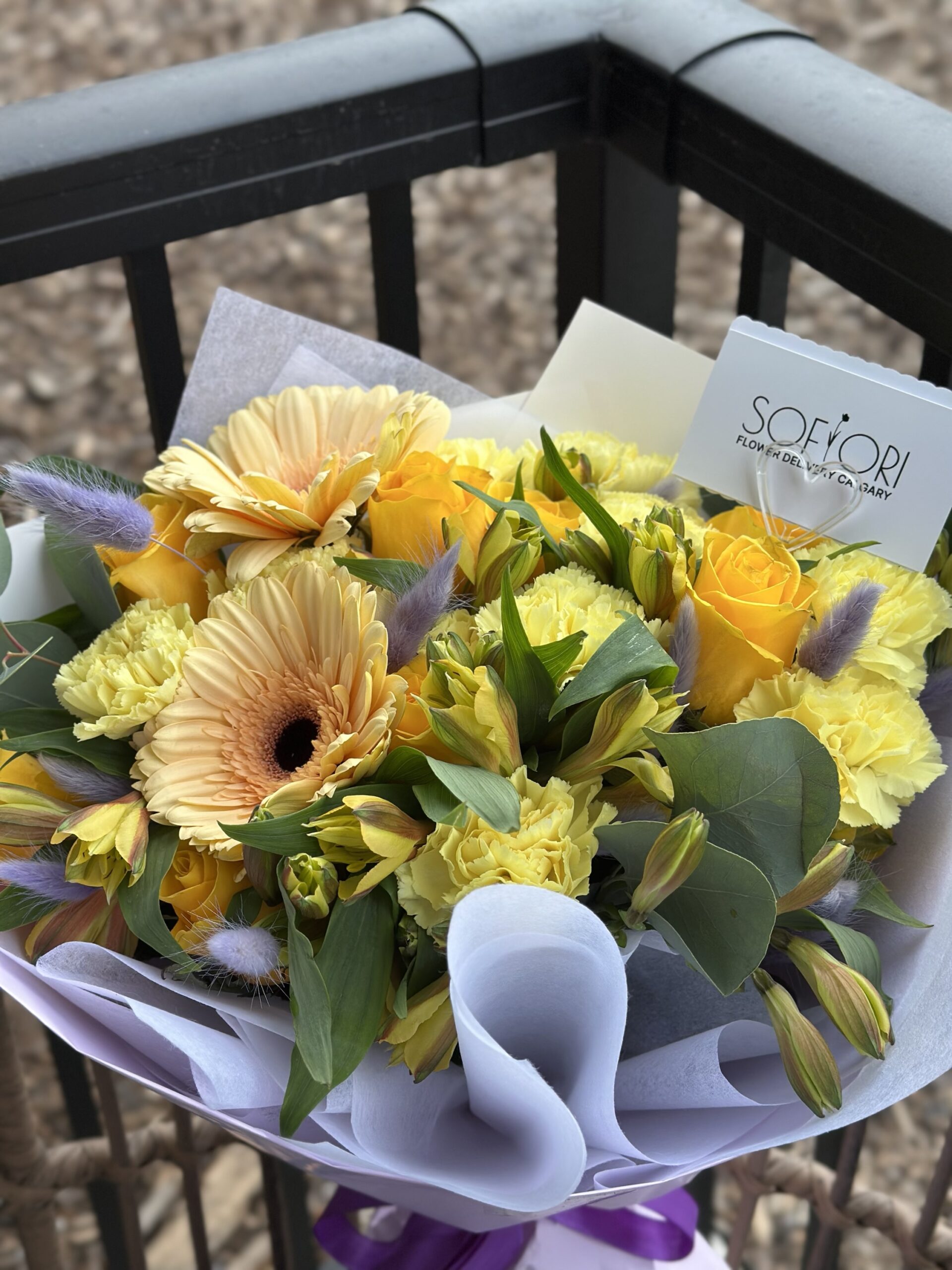 Sofiori’s enchanting bouquet in Calgary features a delightful blend of pastel gerbera daisies, sunny yellow roses, fragrant eucalyptus, and delicate white freesia. This thoughtfully curated arrangement exudes freshness and elegance, making it a perfect choice for brightening any occasion. Order online to bring a touch of floral finesse to your special moments with Sofiori.